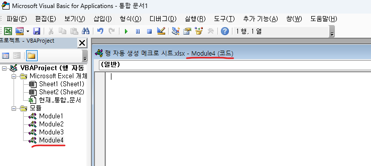 액셀 VBA편집기 Module (메크로) 설정 및 사용 (행 자동 삽입) 본문