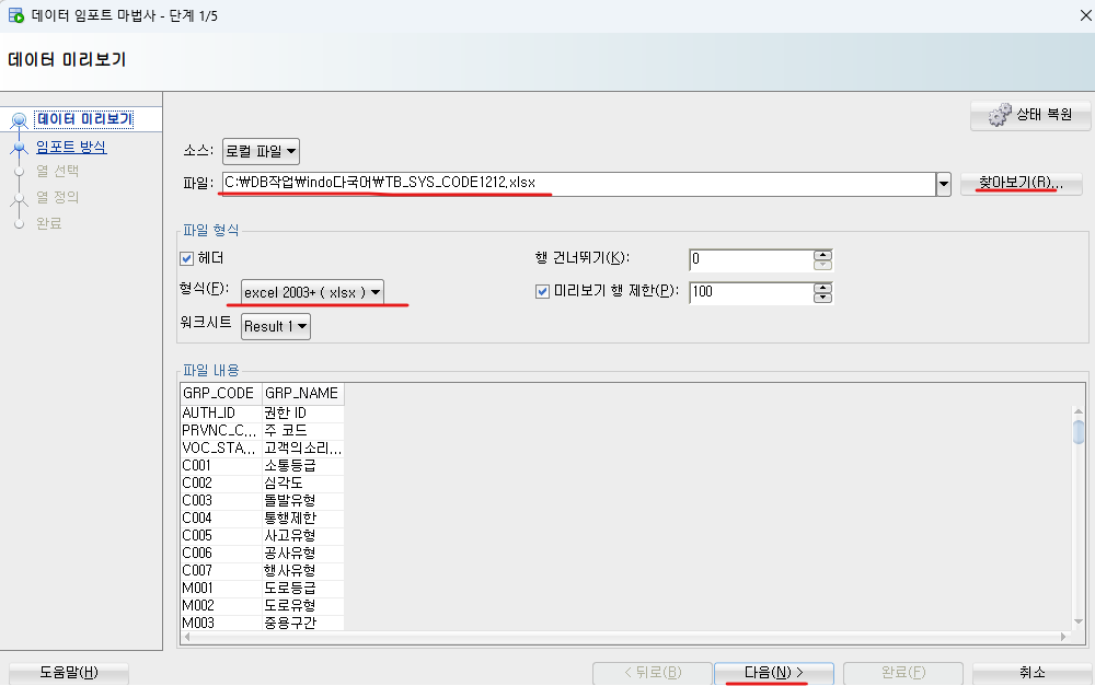 액셀 파일로 임포트 할 수 있으므로 데이터가 들어가 있는 액셀 파일의 경로를 추가해 주고 내용도 확인해준다.