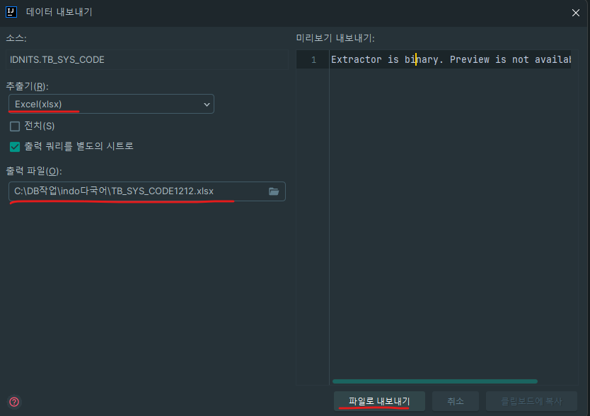 추출할 확장자와 경로를 선택해주고 '파일로 내보내기' 클릭