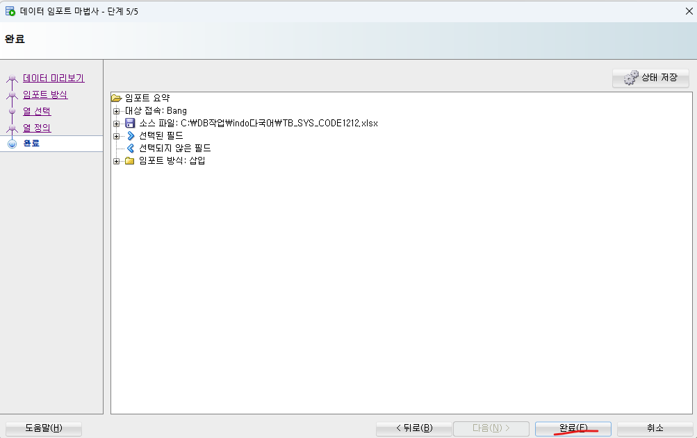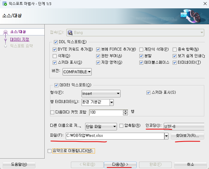 저장할 경로를 설정과 인코딩만 설정해주고 다음으로 계속 넘기다 완료를 클릭해 줍니다.