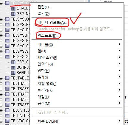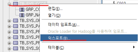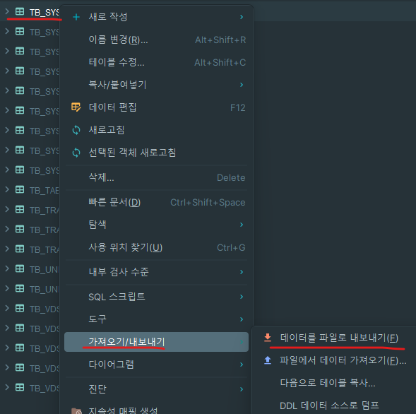 위에 임포트 할때처럼 테이블 오른쪽 마우스 클릭해 임포트 대신 익스포트를 클릭해 줍니다.