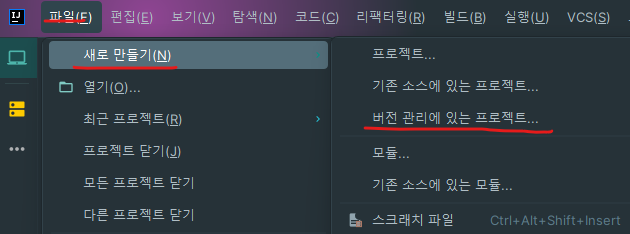 인텔리제이에서 '파일 - 새로만들기 - 버전 관리에 있는 프로젝트' 클릭