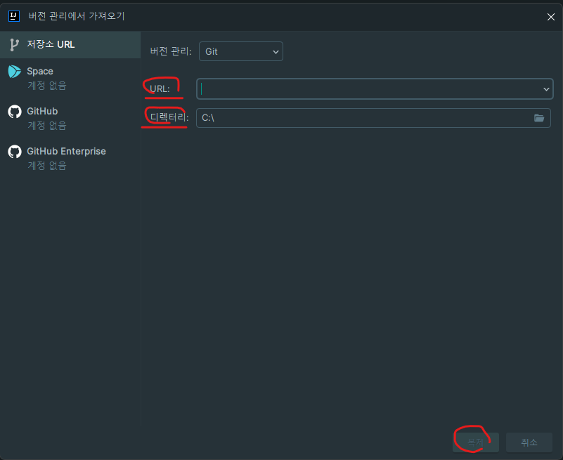 URL은 Git에 올라가있는 프로젝트의 URL을 입력해주거나 복사해 사용해준다.