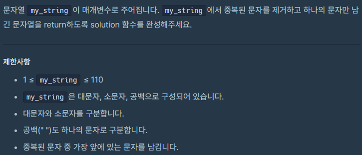 if(!answer.contains(String.valueOf(my_string.charAt(i)))){ //answer에 위에서 가져온 my_string 문자 하나가 포함되어있지 않은 경우
