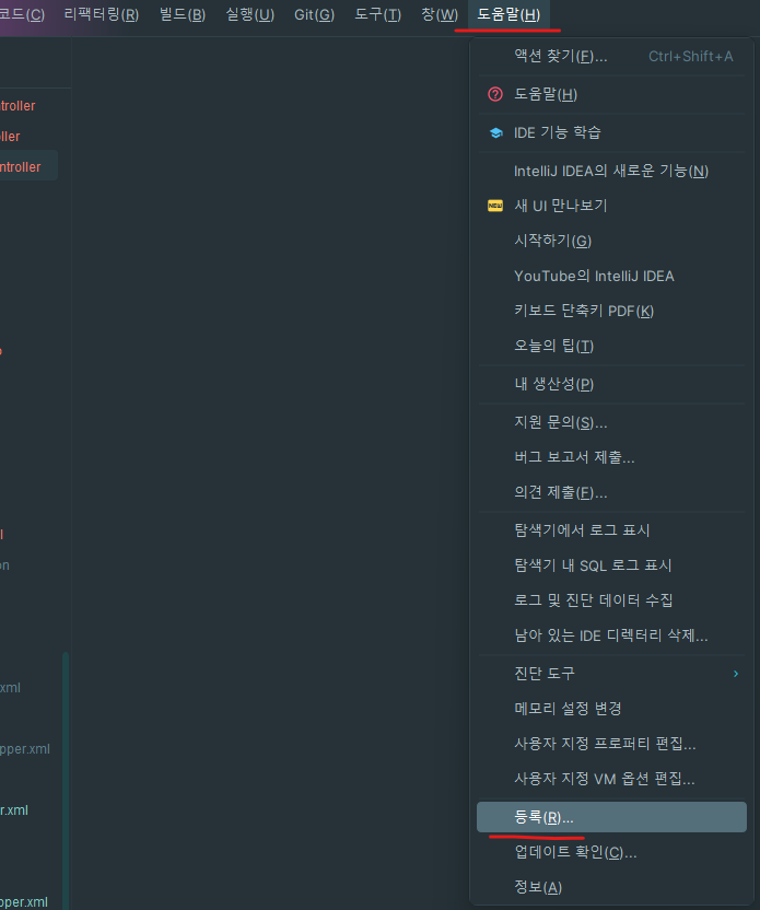 6. 인텔리제이를 들어가 상단 메뉴바 도움말 -> 등록 들어가서 메일주소로 로그인하고 활성화까지 시켜줍니다.