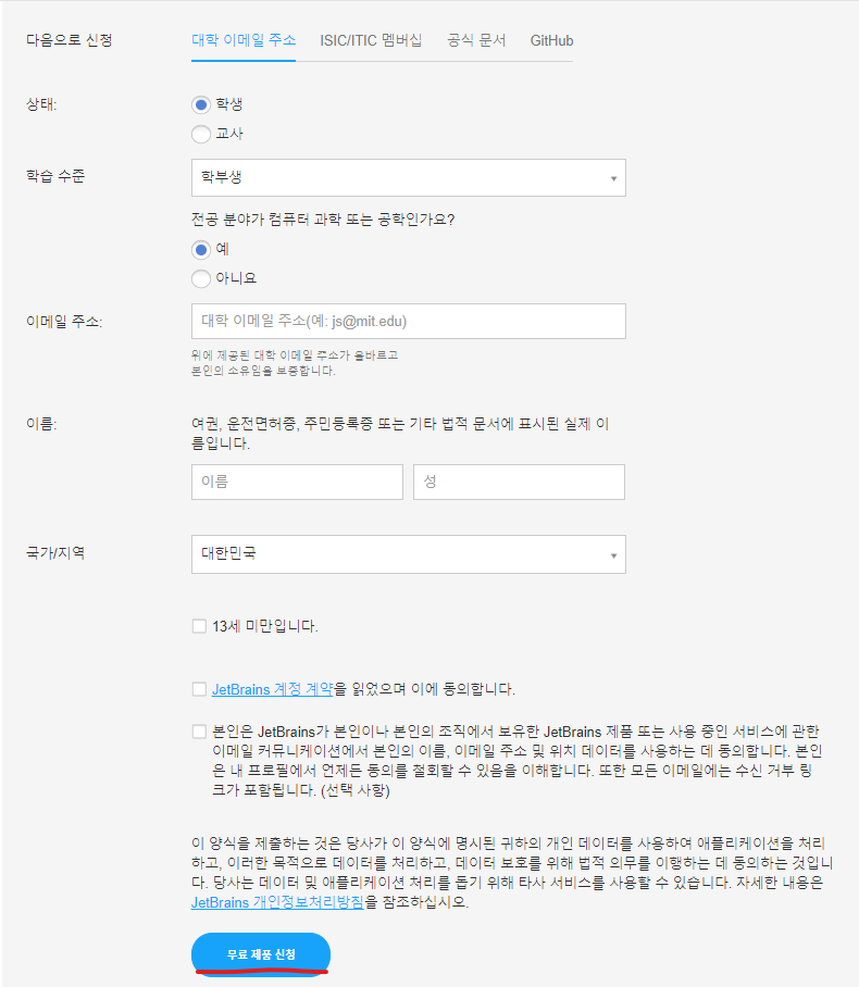 3. 아래 내용들을 적어주고 무료 제품 신청을 해줍니다. 아래 메일주소는 사용가능한 학생메일을 적어주시면 됩니다.