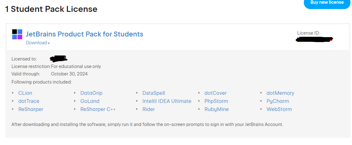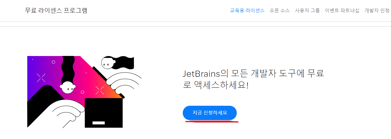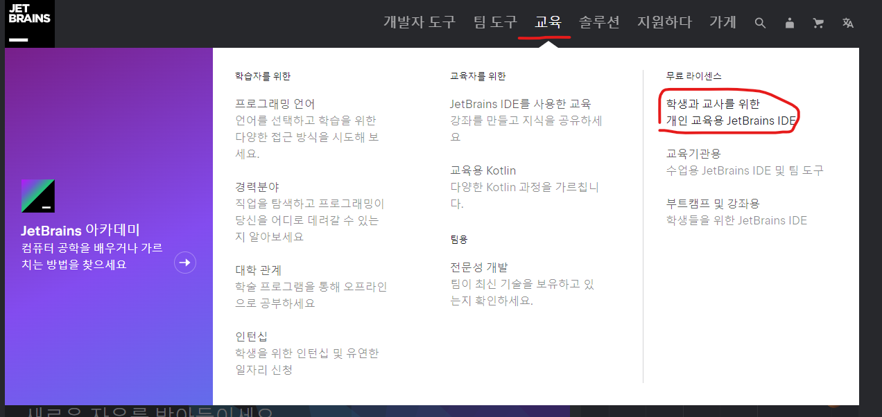 1. 위 링크로 JetBrains 홈페이지에 접속 후 "무료 라이센스에 학생 교사를 위한 교육용 JetBrains IDE"를 클릭해줍니다.