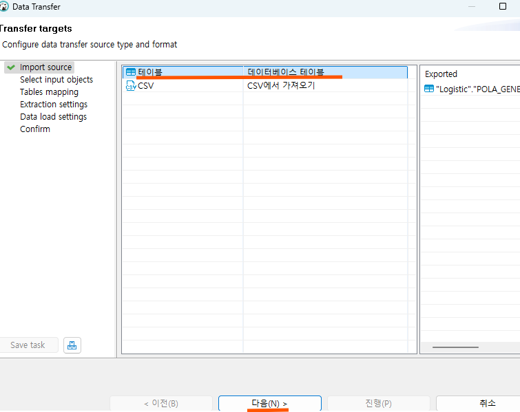 2. 테이블을 옮길거니깐 테이블을 클릭하고 다음으로 간다.