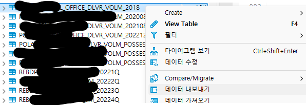 1. 옮기고 싶은 테이블 우클릭 후 '데이터 내보내기' 클릭한다.