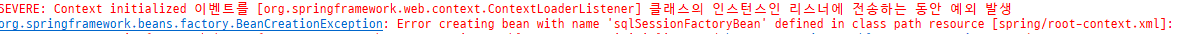 spring 파일업로드 중 에러springframework.beans.factory.BeanCreationException: Error creating bean with name 'sqlSessionFactoryBean' defined in class with path resource 본문