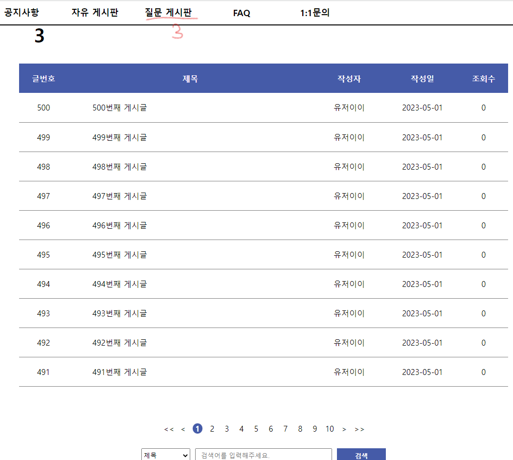 // 전체 게시글 수 : 500개 // 보여지는 게시글 수: 10개