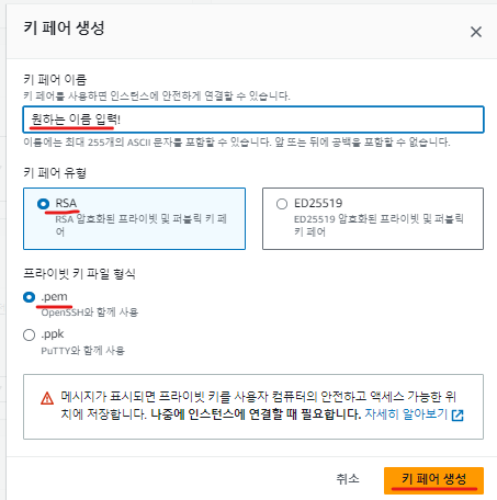 처음이신 분들은 키페어가 없으실거에요 새 키페어 생성을 해주셔야 되용