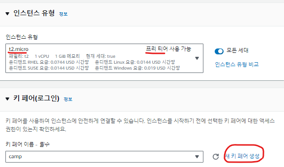 인스턴스 유형은 위와 같이 선택해 주세요 아마 기본값 되있을 겁니다.