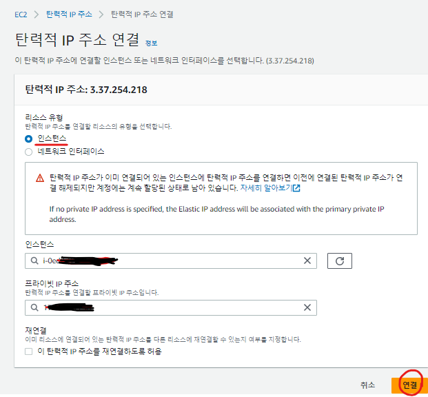클릭해 나의 인스턴스와 프라이빗IP 주소가 나오니 선택해 주시면 됩니다