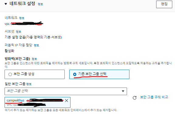저는 기존 보안그룹이 있어 기존 보안그룹 선택을 하였습니다.