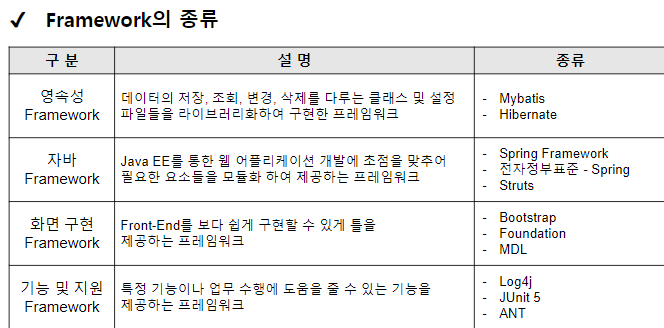 코드의 재사용성을 증가 시키기 위해 일련의 클래스 묶음이나 뼈대, 틀을 라이브러리 형태로 제공되는 것을 말한다.