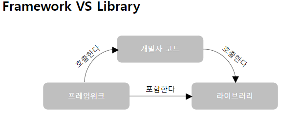 라이브러리와 프레임워크의 차이는 제어 흐름에 대한 주도성이 누구에게 / 어디에게 있는가에 있다. 즉, 애플리케이션의 Flow(흐름)을 누가 쥐고 있느냐에 달려있다.