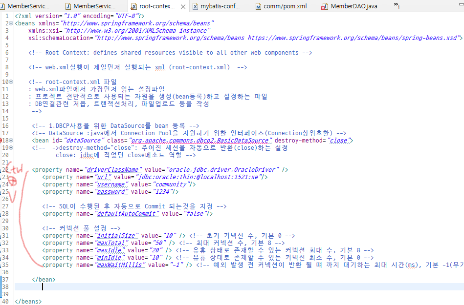 -> JDBC Driver와 Connection 설정, 자동commit막기는 JDBCTemplate를 따로 만들지 않고 /spring/root-context.xml에 만들어준다